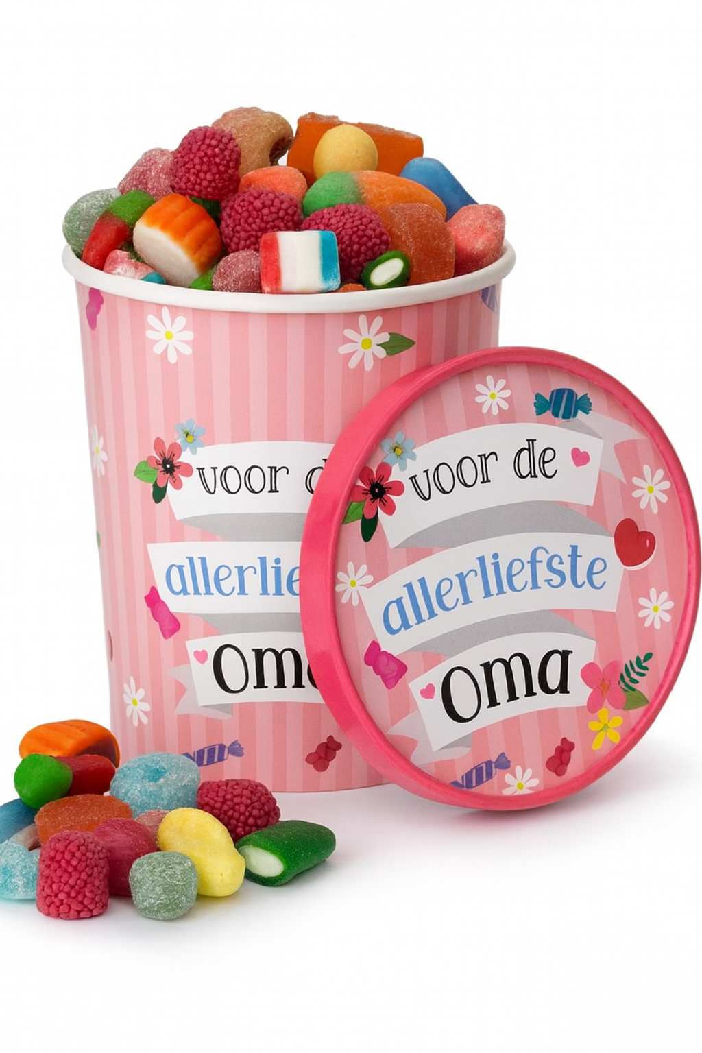 Verras de allerliefste oma met deze Candy Bucket Oma – gevuld met 500 gram heerlijke snoepmix! 🍬