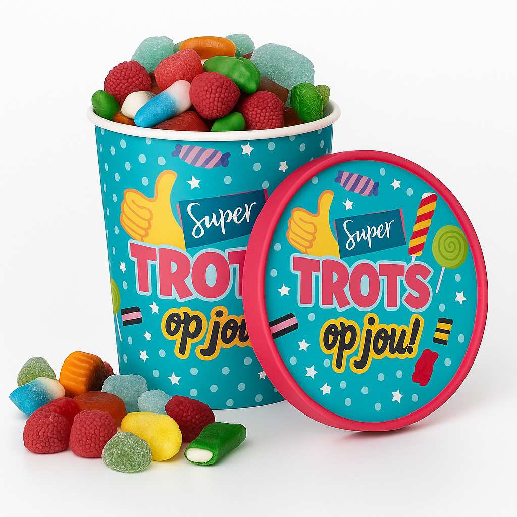 Deze vrolijke emmer zit boordevol 500 gram kleurrijke en heerlijke snoepjes, perfect om te laten zien hoe trots je bent. 🌟